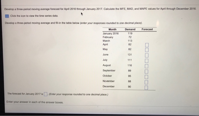 870 882 810 3 854. Develop a three-period moving average forecast for periods 13-15 Period Demand 10 233 403 11 12 469 13 272 14 409 Calculate the forecasts for periods 13-15 by using a three-period moving average model enter your responses rounded to the nearest whole number Period Demand Forecast 10 233 403 11. Similarly we build a series of values for a three-month moving average.